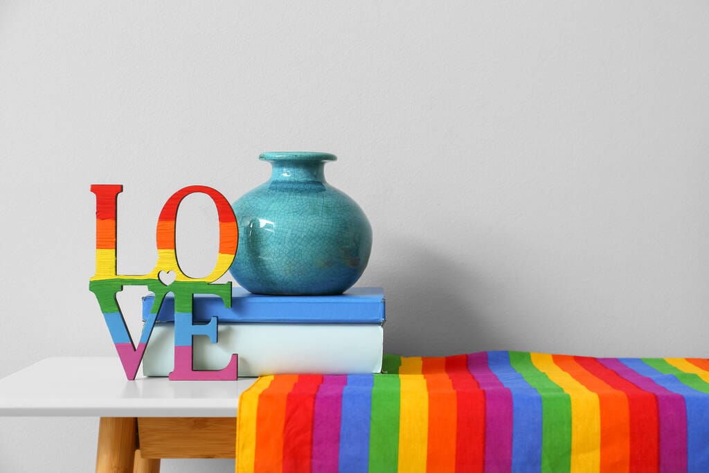 Beautiful vase, books, decor and rainbow flag on table near light wall